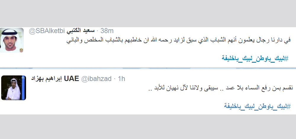 و قال أحد المغردين ويدعى سعيد الكتبي من خلال الوسم" في دارنا رجال يعلمون أنهم الشباب الذي سبق لزايد رحمه الله ان خاطبهم بالشباب المخلص والباني"، وأضاف إبراهيم بهزاد " نقسم بمن رفع السماء بلا عمد .. سيبقى ولائنا لآل نهيان للأبد".