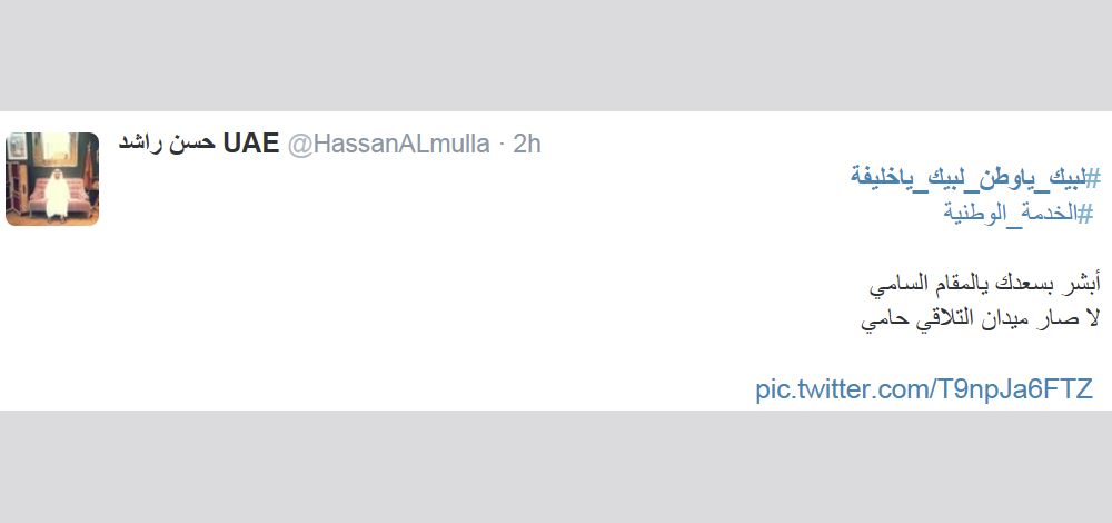 تفاعل مغردون مع الوسم "#لبيك_ياوطن_لبيك_ياخليفة" الذي اطلق في موقع التواصل الاجتماعي"تويتر إذ عبروا من خلاله عن استعدادهم لتلبية نداء الخدمة الوطنية الذي سيبدأ مع نهاية أغسطس الحالي، تقديراً منهم لقانون الخدمة الوطنية الذي اطلقه مجلس الوزراء، برئاسة صاحب السمو الشيخ محمد بن راشد آل مكتوم، نائب رئيس الدولة رئيس مجلس الوزراء، حاكم دبي أخيراً، عن إلزام المواطنين الذكور في الخدمة الوطنية، انسجاماً مع رؤية الإمارات 2021، التي تهدف لأن تصبح الدولة من أفضل دول العالم، إضافة إلى تعزيز الولاء والانتماء وحب الوطن في نفوس الأبناء.