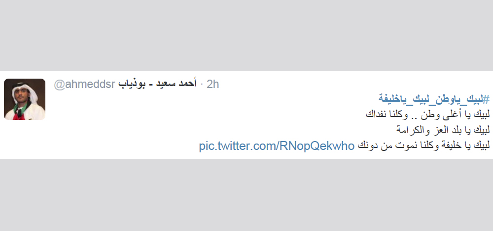 ونشر المغرد حسن راشد" أبشر بسعدك يالمقام السامي لا صار ميدان التلاقي حامي"، ورد المغرد أحمد سعيد-بوذياب" لبيك يا أغلى وطن .. وكلنا نفداك لبيك يا بلد العز والكرامة لبيك يا خليفة وكلنا نموت من دونك".