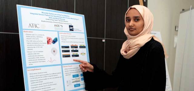 ابتكرت الطالبتان بجامعة خليفة، تماضر محمد (ماجستير البحث العلمي)، وميسم وهبة (ماجستير الإلكترونيات)، جهازاً صغيراً قادراً على قياس العمليات الحيوية في جسم الإنسان، مثل السكري ومعدل دقات القلب، وقياس نسبة الغلوكوز في الدم، ويمكن وضعه على المعصم مثل الساعة، وذلك بديلاً عن الأجهزة كبيرة الحجم الموجودة في العيادات. وأوضحتا أن هذه الفكرة تجعل عملية متابعة الشخص لوضعه الصحي مستمرة وبشكل أسهل.
