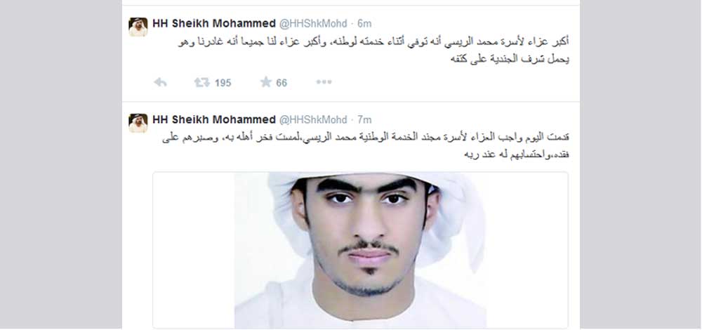 وقال صاحب السمو الشيخ محمد بن راشد آل مكتوم على صفحة سموه في موقع التواصل الإجتماعي "تويتر": " قدمت اليوم واجب العزاء لأسرة مجند الخدمة الوطنية محمد الريسي، لمست فخر أهله به، وصبرهم على فقده، واحتسابهم له عند ربه".