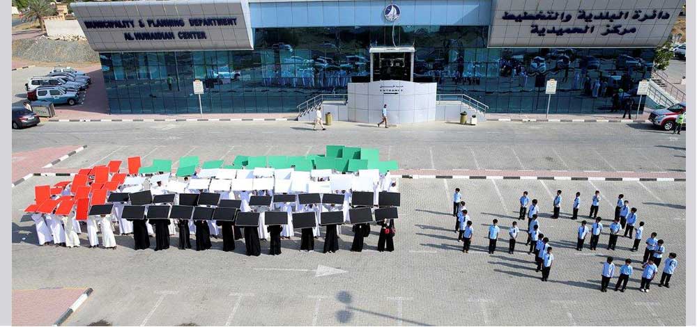 أطلقت دائرة البلدية والتخطيط بعجمان مبادرة العلم البشري بمناسبة الاحتفال بيوم العلم، وردد الموظفون بصوت واحد في مركز الحميدية التابع للدائرة، النشيد الوطني وهم يحملون ألوان العلم فوق رؤوسهم، مشكلين في الساحة الكبيرة بالمركز، العلم البشري، من خلال مشاركة 100 موظف وموظفة من موظفي الدائرة، وعدد من طلبة المدارس الذين شكلوا رقم 43 بأجسادهم في الساحة.