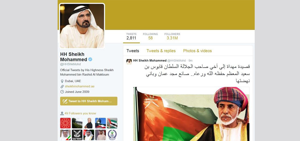 نشر صاحب السمو الشيخ محمد بن راشد آل مكتوم، نائب رئيس الدولة، رئيس مجلس الوزراء، حاكم دبي عبر صفحته في موقع التواصل الاجتماعي "تويتر" قصيدة في 19 بيتاً لسلطان عمان قابوس بن سعيد، بعنوان " صانع المجد".