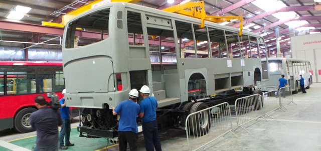 وقال في شرحه إن جميع أجزاء هيكل الحافلة مجمعة بطريقة اللحام، أما بالنسبة للـ«بانوهات» الخارجية فهي قطعة واحدة بطول الحافلة، مصنعة من صاج مجلفن مشكل على البارد، مقاوم للصدأ ومعزول كلياً، مع دعامات أمامية وخلفية مصنعة من الفايبرجلاس المقوى بدعامات معدنية من الداخل.