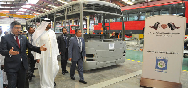 وزار الجابر مصنع شركة «حافلات» الوطنية للصناعة في منطقة المصفح الصناعية في أبوظبي لتفقد سير العمل بالخطوط الإنتاجية للشركة، ومعاينة النموذج والشكل النهائي للحافلات التي سيتم توريد 300 منها ضمن المشروع الإماراتي الرامي لتوفير 600 حافلة، ستغطي 30% من احتياجات هيئة النقل العام في منطقة القاهرة الكبرى، للإسهام في تخفيف ضغط الحركة المرورية على شبكة الطرق، والحد من حوادث السير، وتقديم خدمات النقل لما يصل إلى 600 ألف راكب يومياً، يوفرون من خلال تلك الحافلات 50% من أجرة النقل.