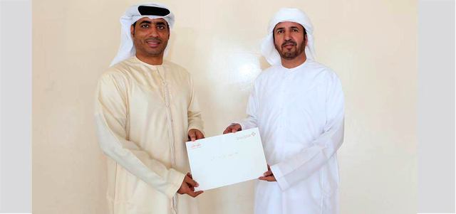 اللواء الدكتور ناصر لخريباني النعيمي يتسلم الشيك من سامي الريامي. تصوير: إريك أرازاس