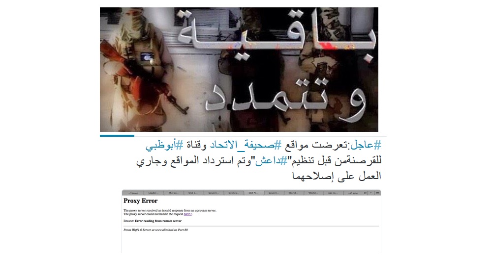 تعرض موقعا صحيفة الاتحاد الإماراتية وقناة أبوظبي، مساء أمس، لاختراق قراصنة من تنظيم داعش ما تسبب بوقف الموقعين عن العمل لعدة ساعات.