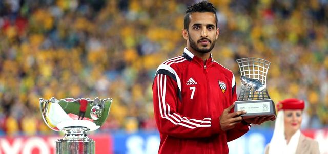 مبخوت يتسلم جائزة هداف آسيا. تصوير: أسامة أبوغانم
