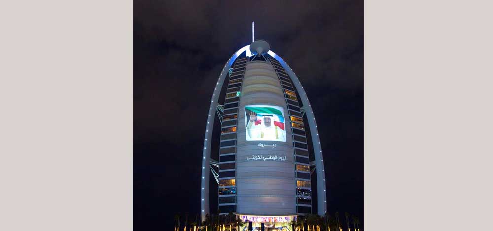 ونشر سموه صورة لبرج العرب مضيئا بصورة لأمير الكويت إحتفاء بعيدها الوطني.