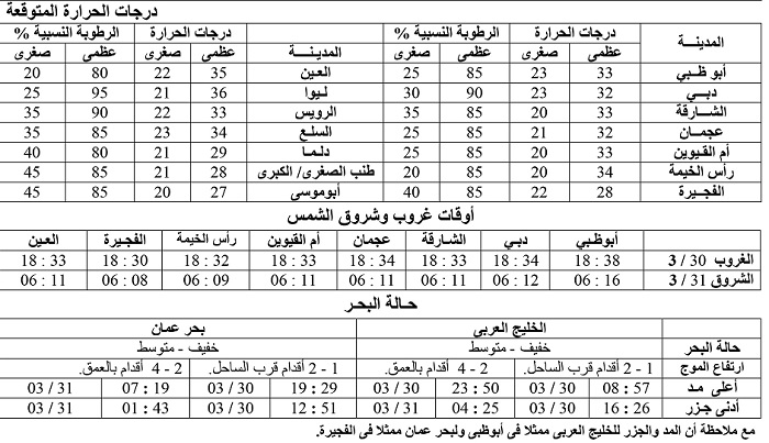 توقع المركز الوطني للأرصاد الجوية أن یكون الطقس صحوا إلى غائم جزئي أحیانا على بعض المناطق، بينما یطرأ إرتفاع طفیف في درجات الحرارة خاصة على المناطق الداخلیة، مع ازدياد نسبة الرطوبة في ساعات اللیل والصباح الباكر على بعض المناطق الساحلیة والداخلیة مع احتمال تشكل بعض الضباب خاصة المناطق الشمالیة.
