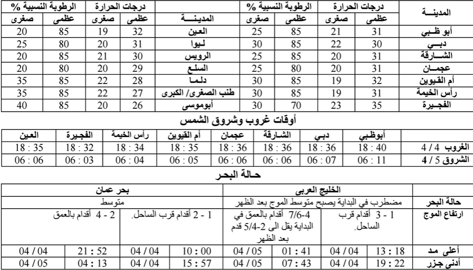 وتوقع المركز أن يكون البحر خفیفا إلى متوسط الموج في الخلیج العربي یضطرب تدریجیاً لیل الأحد وحتى نھایة الفترة، وخفیف إلى متوسط في بحر عمان، وتزداد الرطوبة النسبیة في ساعات اللیل والصباح الباكر على بعض المناطق الساحلیة والداخلیة.
