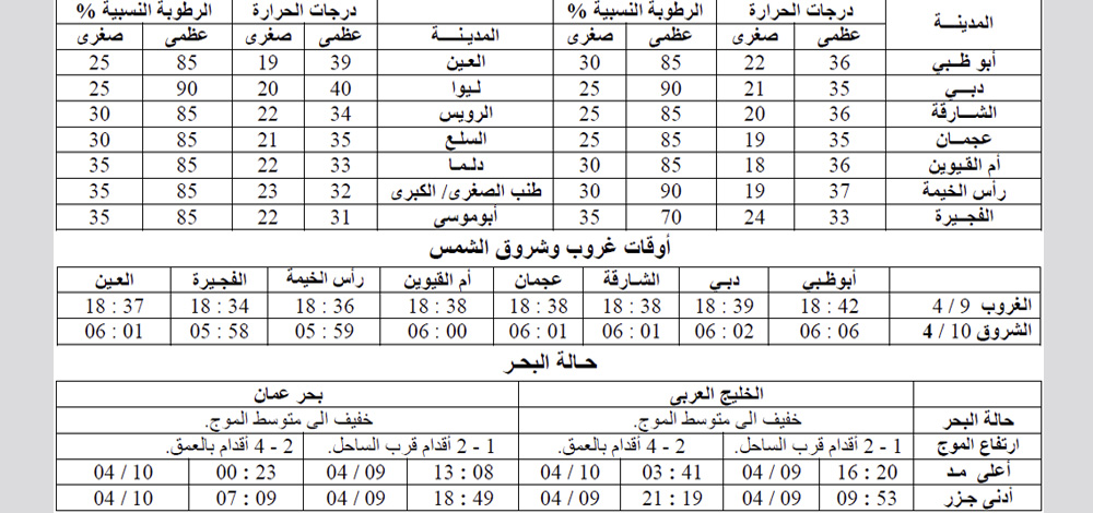 كما توقع المركز أن يكون الطقس في اليومين القادمين غائماً جزئیاً على بعض المناطق، ومائل للحرارة نھاراً ومعتدل لیلاً، وتكون الریاح خفیفة إلى معتدلة السرعة بوجه عام، قد تنشط أحیاناً، والبحر خفیف إلى متوسط الموج في الخلیج العربي وبحر عمان، وتزداد الرطوبة النسبیة في ساعات اللیل والصباح الباكر على بعض المناطق الساحلیة والداخلیة.