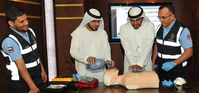 وشارك في الورشة عدد من موظفي الهيئة، الذين حرصوا على الاستفادة من فريق الإسعاف المجتمعى التابع لشرطة أبوظبي، والاستماع إلى النصائح والإرشادات الواجب مراعاتها عند مساعدة المصابين.