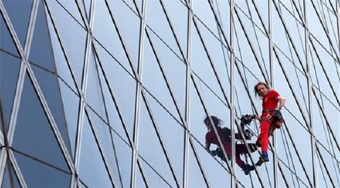 واستخدم المغامر الذي بات يعرف بـ"الرجل العنكبوت" شريطا لاصقا في أطراف أصابعه فقط، لتسلق برج مكون من 75 طابقا.