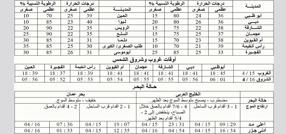 كما توقع المركز أن يكون الطقس لليومين القادمين صحواً بوجه عام، وغائماً جزئياً أحياناً على بعض المناطق، والرياح خفيفة إلى معتدلة السرعة بوجه عام، والبحر خفيف إلى متوسط الموج في الخليج العربي وبحر عمان، وتزداد الرطوبة النسبية في ساعات الليل والصباح الباكر على بعض المناطق الساحلية والداخلية.