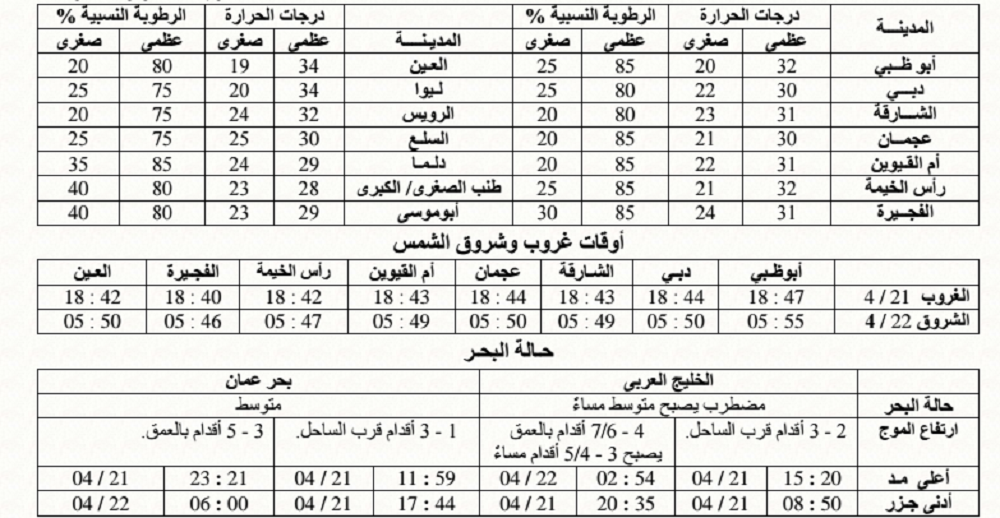 وسيكون البحر مضطرب يصبح متوسط مساء مع ارتفاع الموج من قدمين إلى ثلاثة أقدام قرب الساحل ومن اربعة الى ستة وسبعة أقدام بالعمق بصبح ثلاثة الى اربعة وخمسة اقدام مساء .. ويبلغ أعلى مد عند الساعة الثالثة و 20 دقيقة بعد الظهر وأدنى جزر عند الساعة الثامنة و 50 دقيقة صباحا وعند الساعة التاسعة و 35 دقيقة مساء.