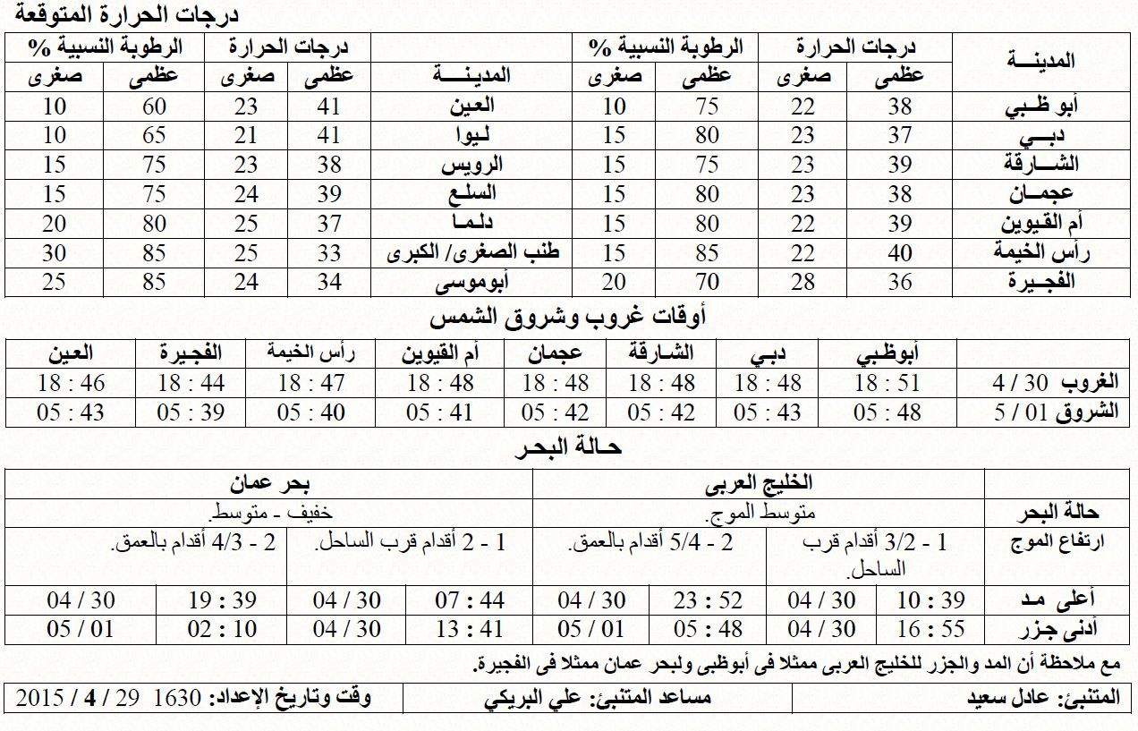 خفيف إلى متوسط الموج في الخليج العربي وبحر عمان، وتزداد الرطوبة النسبية في ساعات الليل والصباح الباكر على بعض المناطق الساحلية، وكذلك في اليوم التالي فسيكون صحوا بوجه عام، وغائما جزئيا أحيانا، والرياح معتدلة إلى خفيفة السرعة بوجه عام، وتزداد الرطوبة النسبية في ساعات الليل فيما سيتشكل في الصباح الباكر في مناطق ساحلية وداخلية، بعض الضباب الخفيف.