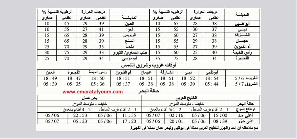 توقع المركز الوطني للزلازل والأرصاد الجوية، أن يكون الطقس خلال اليومين المقبلين، مغبراً وغائماً جزئيا أحيانا، مع ارتفاع تدريجي في درجات الحرارة، والرياح معتدلة السرعة بوجه عام، تنشط أحيانا مثيرة للغبار والأتربة، خاصة في الفترات الصباحية، والبحر متوسط الموج في الخليج العربي، وخفيف إلى متوسط الموج في بحر عمان.