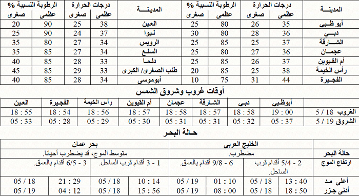 كما توقع المركز أن يكون الطقس لليومين المقبلين صحواً بوجه عام، وغائماً جزئياً أحياناً على بعض المناطق، والرياح معتدلة إلى خفيفة السرعة بوجه عام، وتميل درجات الحرارة للارتفاع التدريجي، والبحر مضطرب صباح الغد في الخليج العربي، يصبح متوسط الموج بعد الظهر، ويكون متوسط الموج إلى خفيف في بحر عمان، وتزداد الرطوبة النسبية في ساعات الليل والصباح الباكر على بعض المناطق الساحلية والداخلية، مع احتمال تشكل بعض الضباب.