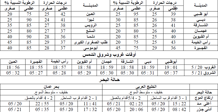 كما توقع المركز أن يكون الطقس لليومين القادمين، مغبراً وغائماً جزئاً أحیاناً على بعض المناطق، یطرأ ارتفاع أخر في درجات الحرارة، والریاح خفیفة إلى معتدلة السرعة تنشط أحیاناً تكون مثیرة للغبار والاتربة، والبحر خفیف إلى متوسط الموج في الخلیج العربي وفي بحر عمان، وتزداد الرطوبة النسبیة في ساعات اللیل والصباح الباكر على بعض المناطق الساحلیة والداخلیة.