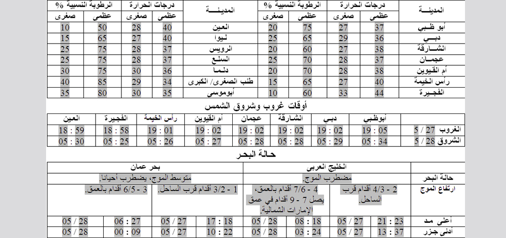 كما توقع المركز أن يكون الطقس لليومين القادمين، مغبراً وغائماً جزئياً أحياناً على بعض المناطق، والرياح معتدلة إلى نشطة السرعة، والبحر مضطرب في الخليج العربي، ومتوسط يضطرب أحياناً في بحر عمان، وتصبح الرياح معتدلة إلى خفيفة السرعة بوجه عام خلال ليل الخميس ويوم الجمعة، والبحر معتدل الموج إلى خفيف في الخليج العربي وبحر عمان، وتزداد الرطوبة النسبية على بعض المناطق الساحلية والداخلية خلال ساعات الليل والصباح الباكر، وقد يتشكل بعض الضباب أو الضباب الخفيف.