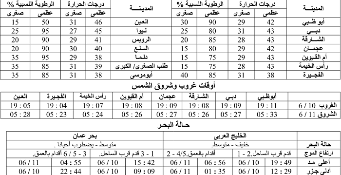 كما توقع المركز أن يكون الطقس في اليومين المقبلين مغبراً وغائماً جزئياً على بعض المناطق وتزداد كميات السحب احياناً شرقاً، والرياح معتدلة السرعة بوجه عام، قد تنشط أحياناً، والبحر متوسط الموج في الخليج العربي، ومضطرب أحياناً في بحر عمان، وتزداد الرطوبة النسبية في ساعات الليل والصباح الباكر على السواحل، وقد يتشكل بعض الضباب والضباب الخفيف خاصة غرباً.
