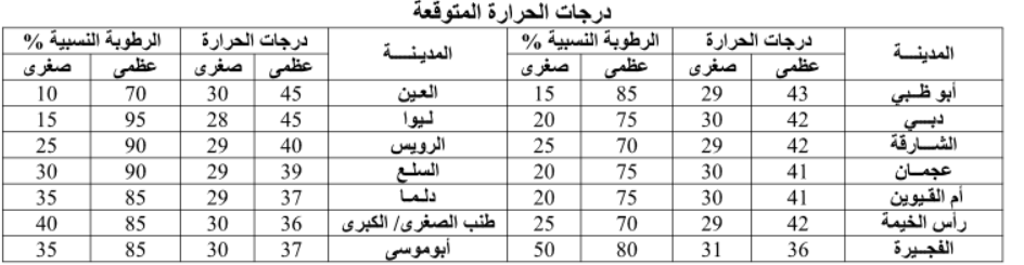 وأشار المركز الى أن الرياح جنوبية شرقية - جنوبية تتراوح سرعتها بين 10و25 كم في الساعة خلال الصباح والليل، بينما تكون شمالية غربية - شمالية شرقية بسرعة تتراوح بين 16 و 34 كم في الساعة بعد الظهر والمساء.