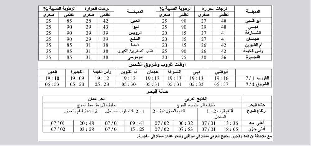 البحر .. خفيف إلى متوسط .. والموج بارتفاع من قدم إلى قدمين وثلاثة اقدام قرب الساحل ومن 2 - 4 أقدام بالعمق.. يبلغ أعلى مد عند الساعة الواحدة و36 دقيقة وأدنى جزر عند الساعة السادسة و5 دقائق.