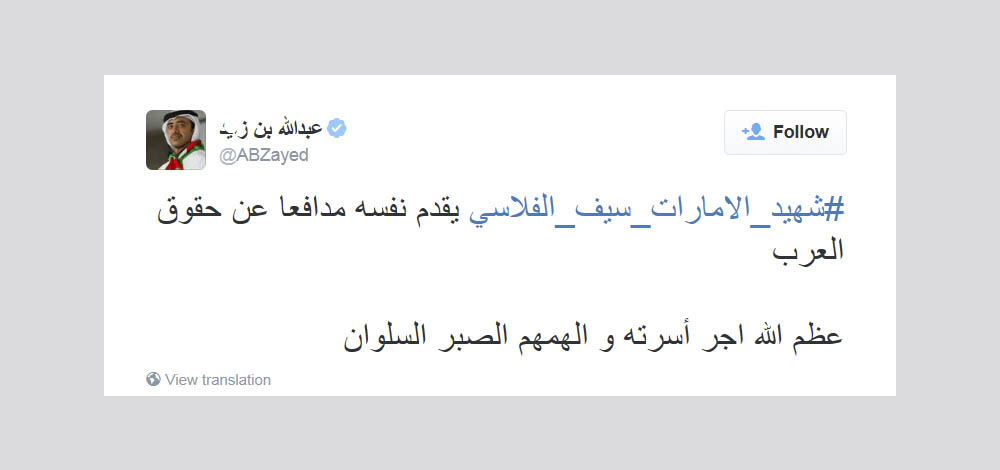 أكد سمو الشيخ عبدالله بن زايد آل نهيان، وزير الخارجية، أن شهيد الإمارات سيف يوسف أحمد الفلاسي، الذي استشهد اليوم، اثناء تأديته واجبه الوطني ضمن القوات المشاركة في عملية #إعادة_ الأمل للتحالف العربي، الذي تقوده المملكة العربية السعودية الشقيقة، للوقوف إلى جانب الحكومة الشرعية في اليمن ودعمها، قدم نفسه دفاعاً عن حقوق العرب.