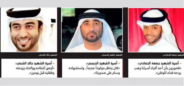 وكانت جثامين شهداء الإمارات الثلاثة قد وصلت إلى مطار البطين في أبوظبي على متن طائرة عسكرية تابعة للقوات الجوية والدفاع الجوي يرافقهم عدد من ضباط وضباط صف القوات المسلحة.