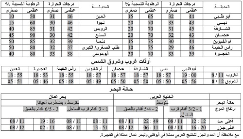 ويكون الطقس في اليومين المقبلين غائما جزئيا ومغبرا أحياناً على بعض المناطق، وتظهر بعض السحب على المناطق الجبلية الشرقية بعد الظهر، والرياح معتدلة السرعة بوجه عام، تنشط أحيانا مثيرة للغبار خاصة شرقا، والبحر متوسط الموج في الخليج العربي، ومتوسط في بحر عمان قد يضطرب أحيانا، وتزداد الرطوبة النسبية ليلا وفي الصباح الباكر على بعض المناطق الساحلية.