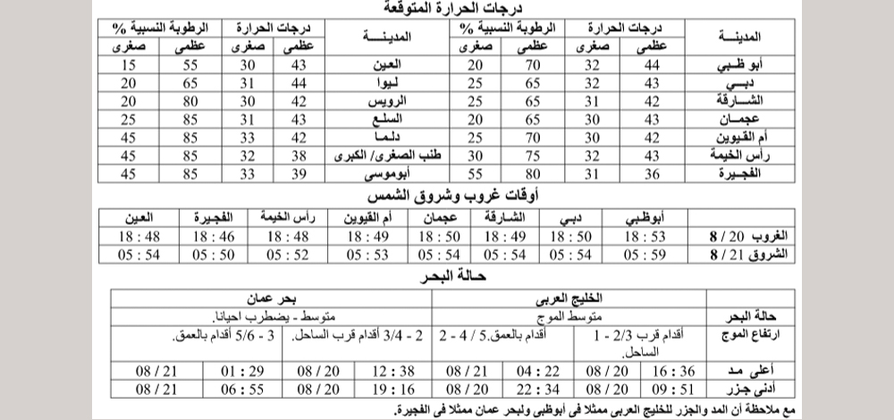 والبحر خفيف إلى متوسط الموج في الخليج العربي، ومتوسط الموج يضطرب أحيانا في بحر عمان، وتزداد الرطوبة نسبيا ليلا وفي الصباح الباكر على بعض المناطق الغربية.