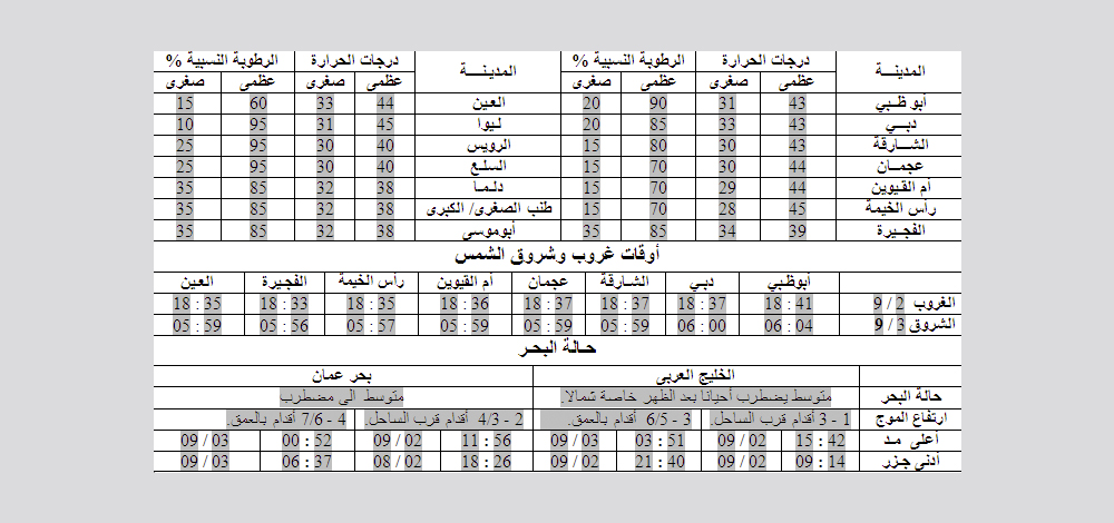 كما توقع المركز أن يكون الطقس في اليومين القادمين مغبراً إلى غائم جزئياً أحياناً على بعض المناطق، والرياح معتدلة إلى نشطة السرعة، والبحر متوسط الى مضطرب الموج في الخليج العربي وبحر عمان، وتزداد الرطوبة النسبية في ساعات الليل والصباح الباكر على المناطق الساحلية الغربية ويحتمل تشكل بعض الضباب والضباب الخفيف خاصة المناطق الغربية.