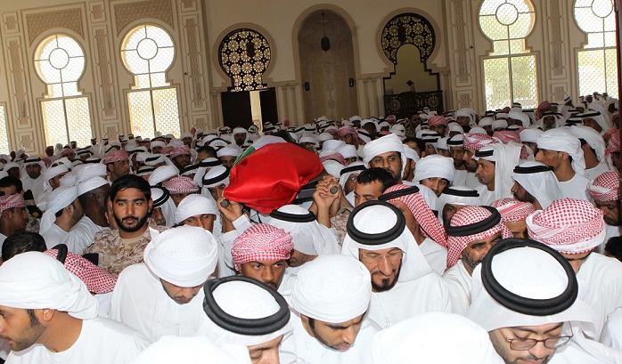 شهد أبناء مدينة العين مساء أمس، صلاة الجنازة على أربعة من أبنائها شهداء الإمارات البواسل الذين لاقوا وجه ربهم الكريم خلال مشاركتهم في عملية "إعادة الأمل " ضمن قوات التحالف العربي الذي تقوده المملكة العربية السعودية الشقيقة لإعادة الشرعية في اليمن.
