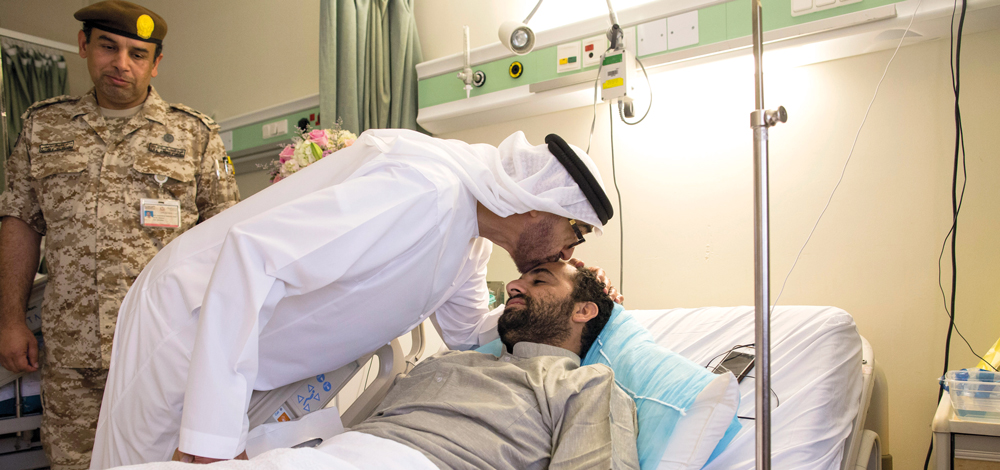 والتقى سموه خلال الزيارة المصابين والجرحى من قواتنا المسلحة البواسل، الذين يتلقون العلاج في المستشفى، واطمأن على حالتهم وأوضاعهم الصحية، وتبادل الأحاديث معهم، مثمناً صمودهم في ميادين الشرف والبطولة، وجهودهم التي بذلوها خلال مهمتهم في الدفاع عن الحق والواجب ونصرة إخوانهم في اليمن.