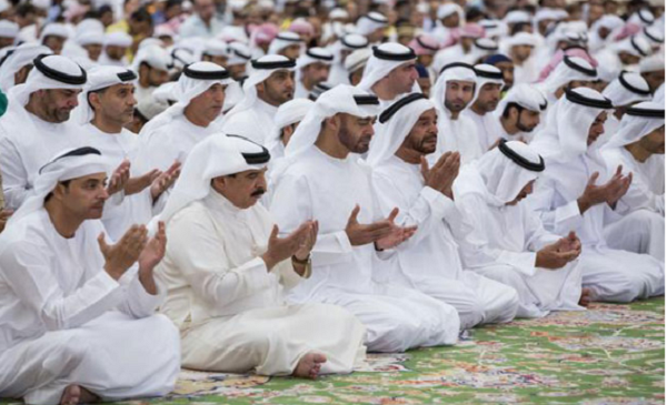 بعدها ادى جلالة الملك حمد بن عيسى آل خليفة وصاحب السمو الشيخ محمد بن زايد آل نهيان مع جموع المصلين صلاة الغائب على شهداء الوطن.