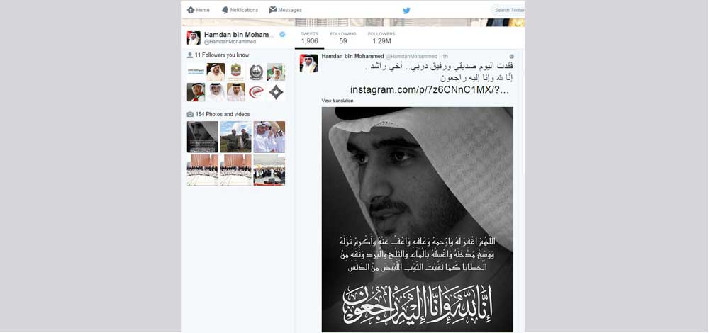وقال سمو ولي عهد دبي في حسابه على موقع انستغرام للتواصل الاجتماعي "فقدت اليوم صديقي ورفيق دربي..أخي راشد..إنَّا لله وإنا إليه راجعون".