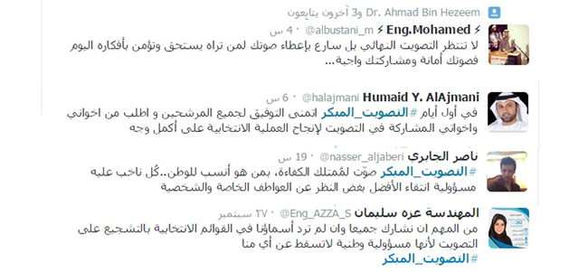 تفاعل عدد من المغردين مع مرحلة التصويت المبكر لانتخابات المجلس الوطني الاتحادي، موجهين عبر حساباتهم نصائح ونداءات لكل من لهم حق التصويت بالإسراع لاختيار مرشحهم، معتبرين أن المشاركة لا تعني منح العضوية لشخص، وإنما هي واجب واطني للدولة ككل.