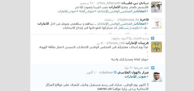 وقال مغرّد باسم «فاخرة»: «ساهم وساهمي بصوتك من أجل الإمارات.. فـ #حكومتنا_تستاهل أن نشاركها طموحاتها في إنجاح الانتخابات».