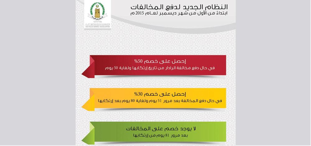 أكد العميد غانم أحمد غانم مدير الإدارة العامة للعمليات المركزية بشرطة رأس الخيمة، أن عدد المستفيدين من مشروع تخفيض قيمة المخالفات المرورية الذي أطلقته مؤخراٍ القيادة العامة لشرطة رأس الخيمة متمثلة بإدارة المرور والدوريات، بلغ نحو 7339 مستفيداً منذ انطلاق المرحلة الأولى لتخفيض المخالفات البالغ نسبتها 50 في المائة، ولمدة خمسة أشهر، من بداية يوليو الماضي حتى مطلع ديسمبر المقبل، أما المرحلة الثانية سينطلق موعدها في الثاني من ديسمبر المقبل لعام 2015م،وسيتم منح الخصم بناءً على الفترة الزمنية للمخالفة اعتباراً من تاريخ ارتكابها