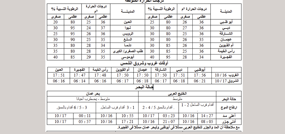 أما البحر فمتوسط الموج في الخليج العربي وبحر عمان، وتزداد الرطوبة النسبية على بعض المناطق الساحلية والداخلية في ساعات الليل والصباح الباكر .