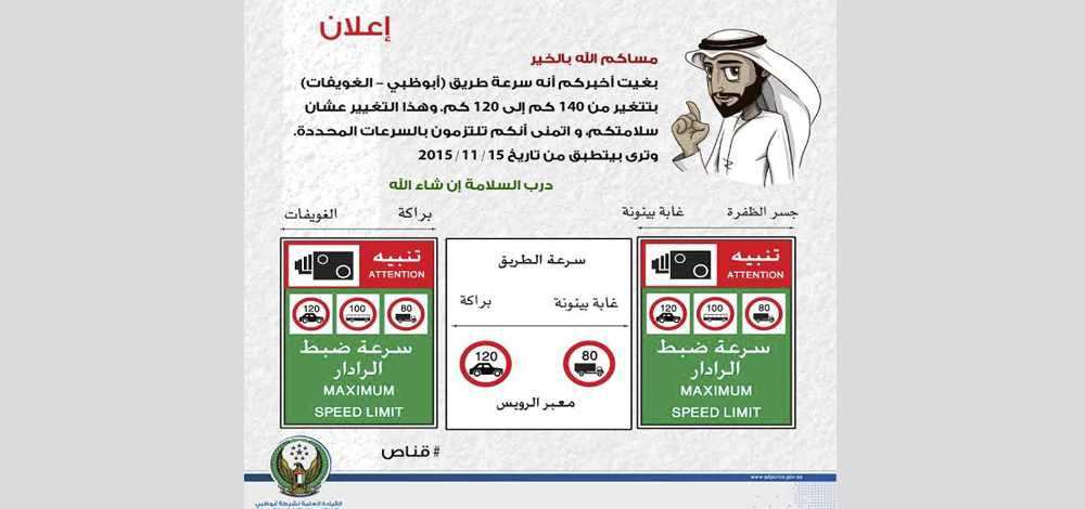 أعلنت شرطة أبوظبي عن عزمها تغيير سرعة ضبط الرادار على طريق أبوظبي – الغويفات، في المسافة الواقعة من براكة وحتى غابة بينونة، إذ سيتم خفض سرعة الطريق من 140 كيلو مترا في الساعة إلى 120 كيلوا مترا في الساعة، ابتداء من 15 نوفمبر المقبل.