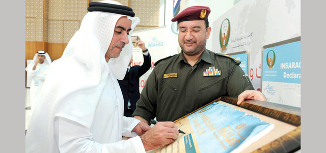 وقّع الفريق سمو الشيخ سيف بن زايد آل نهيان، نائب رئيس مجلس الوزراء وزير الداخلية، أمس، على اللوحة الخاصة بـ«إعلان أبوظبي 2015»، في الاجتماع العالمي للبحث والإنقاذ، الذي يهدف إلى تعزيز معايير التأهب والاستجابة في العمليات الوطنية والدولية للبحث والإنقاذ في المناطق المدنية، ويؤكد التزام فرق البحث والإنقاذ الدولية بقرار الجمعية العامة للأمم المتحدة رقم 57/150 لعام 2002، والخاص بتعزيز فاعلية وتنسيق المساعدات في مجال العمليات الدولية للبحث والإنقاذ في المناطق المدنية من عام 2015 إلى عام 2020.
