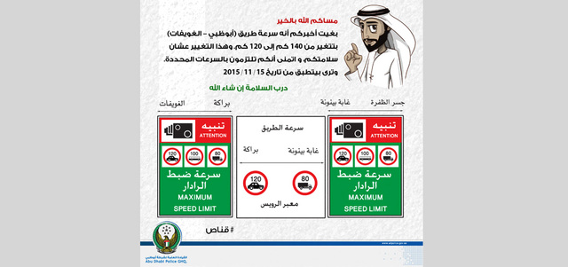 وأوضح الخييلي أن حدود السرعة المعدلة على الطريق من أبوظبي إلى الغويفات تقسم إلى ثلاث مراحل: الأولى تبدأ من تحويلة جسر الظفرة إلى غابات بينونة (مسافتها 176/كلم ذهاباً وإياباً) وحدود السرعة المسموح بها 100 كلم/ ساعة، وسرعة ضبط الرادار بإضافة هامش السرعة 121، والثانية تكون حدود السرعة على امتداد الطريق من غابات بينونة إلى منطقة براكة في حدود 120 كلم/ساعة؛ وسرعة ضبط الرادار 141 كلم/ساعة؛ بينما تكون المرحلة الثالثة على امتداد الطريق من براكة إلى الغويفات (مسافتها 64/كلم ذهاباً وإياباً)، والسرعة المسموح بها 100 كلم/ساعة، وسرعة ضبط الرادار 121 كلم/ساعة، فيما تبقى السرعة القصوى للنقل الثقيل (الشاحنات) 80 كلم/ساعة، و100 كلم/ساعة بالنسبة لحافلات نقل الركاب على مراحل الطريق كافة. وأشار إلى أن المديرية وضعت اللوحات الإرشادية على الطريق التي توضح سرعة الطريق، وسرعة ضبط الرادار، مؤكداً أن الهدف الأساسي من استخدام الرادارات ليس ضبط مستخدمي الطريق، إنما توجيههم إلى خفض السرعات بما يحقق أولوية شرطة أبوظبي بالحفاظ على السلامة المرورية.