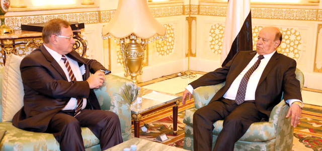 بحث الرئيس اليمني عبد ربه منصور هادي، في مقر إقامته بالرياض، أمس، مع سفير جمهورية روسيا الاتحادية لدى المملكة العربية السعودية، أوليغ أوزيروف، العلاقات الثنائية بين البلدين وسبل تعزيزها وتطويرها في مختلف المجالات، وناقش الجانبان الأوضاع على الساحة اليمنية، ومعاناة أبناء الشعب اليمني تداعيات الحرب التي تشنها ميليشيا الحوثي والمخلوع صالح الانقلابية، التي تعد كارثة حقيقية على الشعب اليمني. ونقلت وكالة الأنباء اليمنية عن منصور هادي قوله: «إننا ننشد السلام والوئام والتعايش مع محيطنا العربي والإقليمي، ونمد أيدينا للسلام من أجل أمن واستقرار اليمن، والعمل معاً نحو البناء والتنمية التي يتطلع إليها جميع أبناء شعبنا اليمني بعيداً عن الإقصاء والتهميش ولغة السلاح التي اختارها الانقلابيون سبيلاً لفرض منطقهم المعادي لمجتمعنا ومحيطنا العربي».