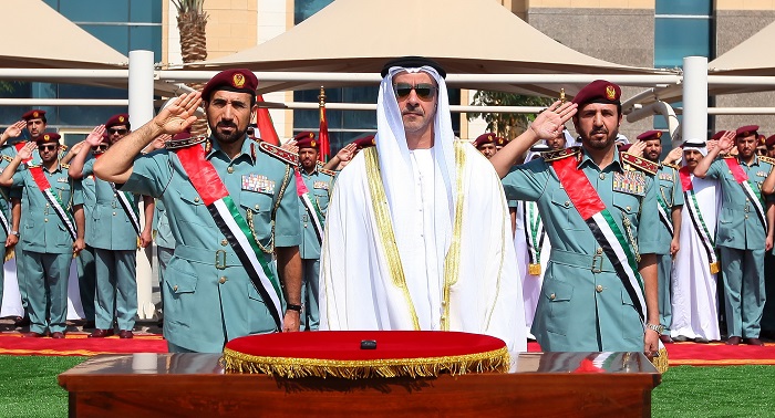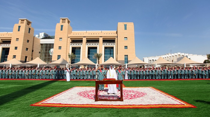 وكانت مراسم الاحتفال بهذا اليوم قد بدأت بسلام العلم، تزامناً مع رفع سموه علم الدولة لينساب بمهابة وإجلال خفاقاً في الآفاق، ثم عزفت موسيقى الشرطة السلام الوطني، بمشاركة من الطلبة المرشحين في كلية شرطة أبوظبي، وتشكيلات من منتسبي ومنتسبات كل من : قوات الأمن الخاصة "ق7" ومديرية المرور والدوريات، والدعم الأمني والشرطة النسائية، ومدارس الشرطة، والإدارة العامة للحراسات والمهام الخاصة، مع نقل مباشر وتصوير من طائرات الدعم الجوي.