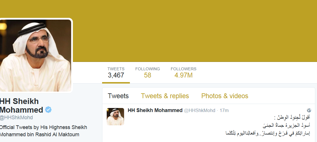 نشر صاحب السمو الشيخ محمد بن راشد آل مكتوم، نائب رئيس الدولة رئيس مجلس الوزراء حاكم دبي، على حسابه في "توتير" تغريدة بمناسبة عودة الدفعة الأولى من قواتنا المسلحة في اليمن واستعداد الدفعة الثانية للمشاركة ضمن قوات التحالف العربي بقيادة المملكة العربية السعودية قال فيها :