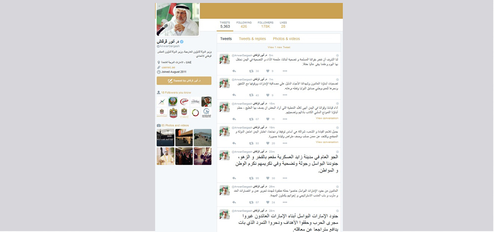 وأكد وزير الدولة للشؤون الخارجية وزير الدولة لشؤون المجلس الوطني الاتحادي في تغريدة أخرى أن "أداء قيادتنا وقواتنا في اليمن أنهى للأبد النمطية التي أراد البعض ان يصف بها الخليج ، حطم أبناؤنا النموذج السلبي الكاذب بأدائهم وتضحيتهم".