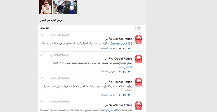 أكد القائد العام لشرطة دبي، اللواء خميس مطر المزينة، أن ما تناقلته وسائل التواصل الإجتماعي الليبية عن إلقاء القبض على ضابط من شرطة دبي بتهمة التجسس لصالح دولة أجنبية عار من الصحة وبعيد عن المصداقية، حيث أن المدعو (ي، ص، ا) كان يعمل في شرطة دبي برتبة رقيب وإنتهت علاقته مع الشرطة قبل 5 سنوات وقد تم فصله من الخدمة العسكرية بعد تورطه في قضية أخلاقية وحكم عليه بالإستغناء عن خدماته وتجريده من الرتبة العسكرية منذ العام 2010.