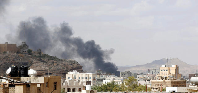 الدخان يتصاعد فوق موقع للمتمردين الحوثيين في صنعاء بعد أن قصف في غارة للتحالف. أ.ب